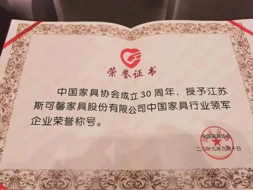 中國家具行業領軍企業榮譽稱號